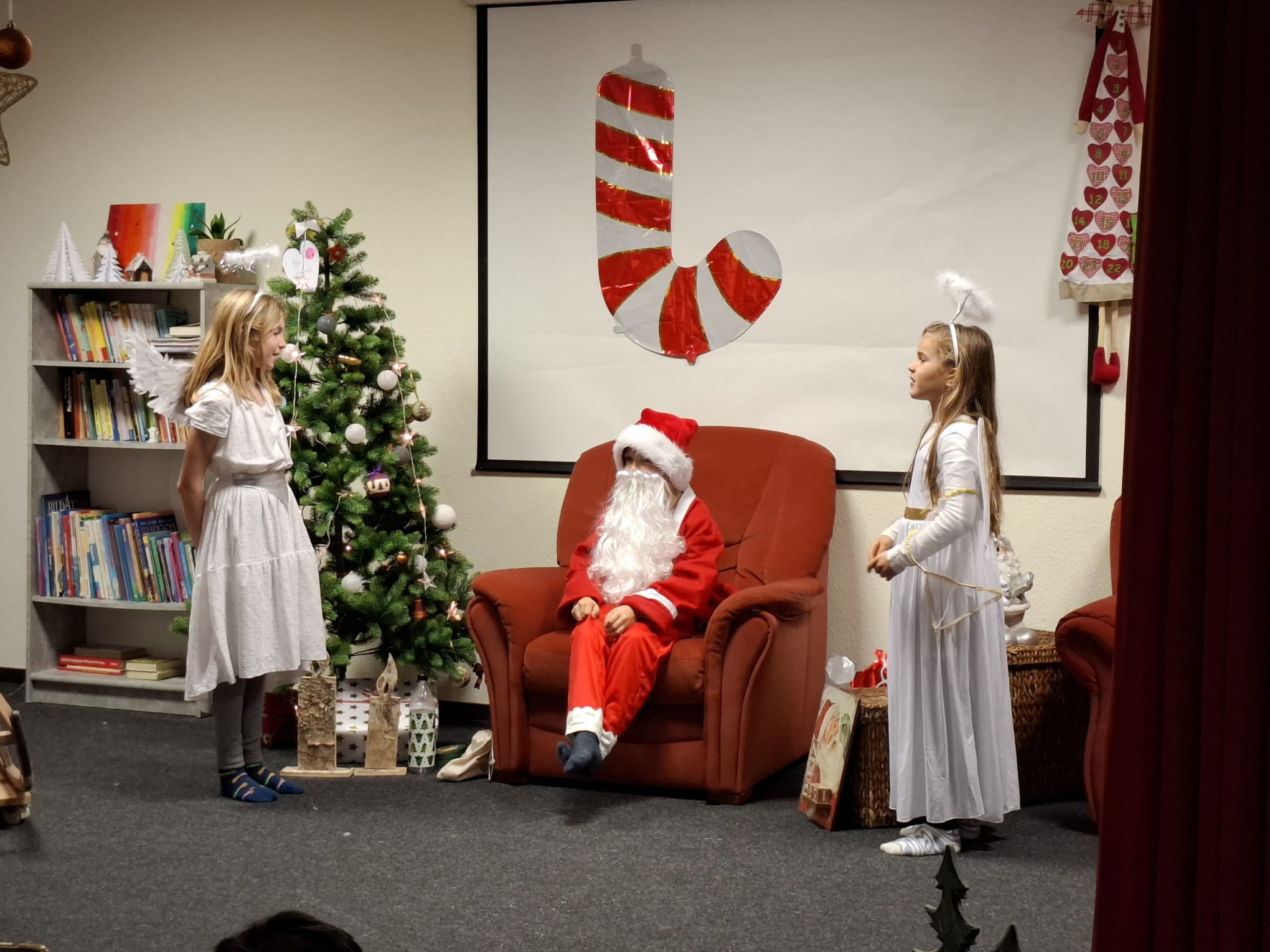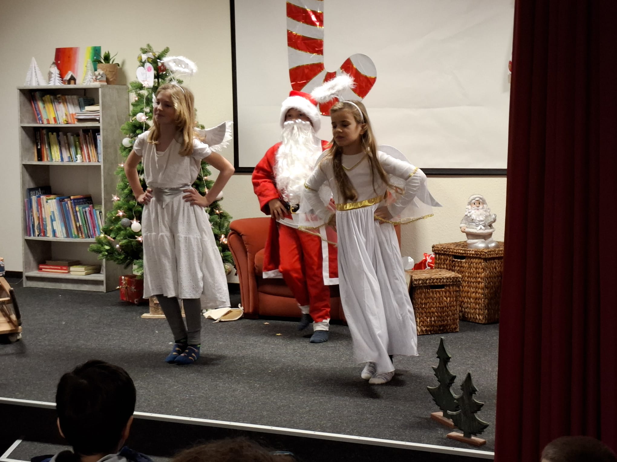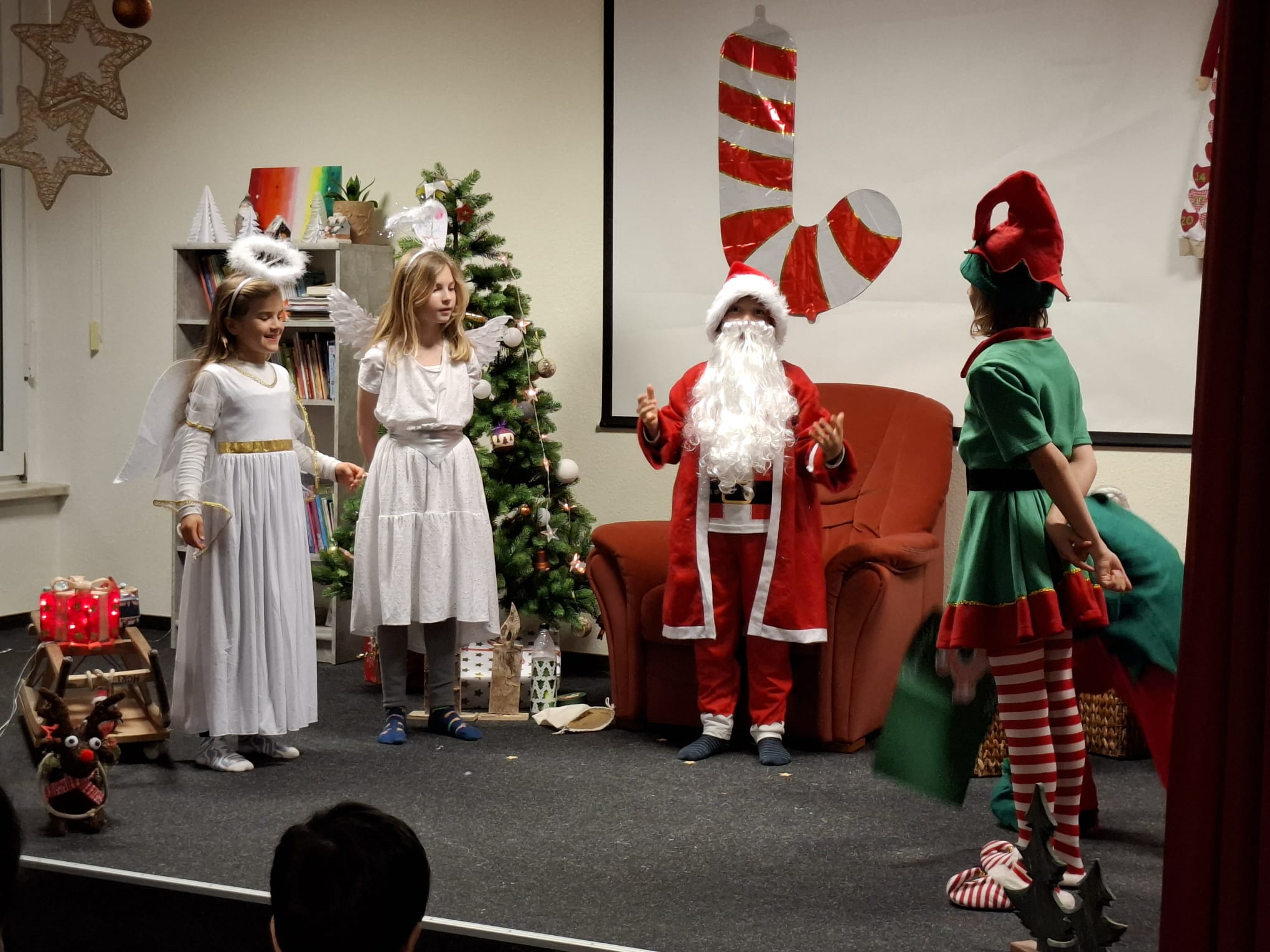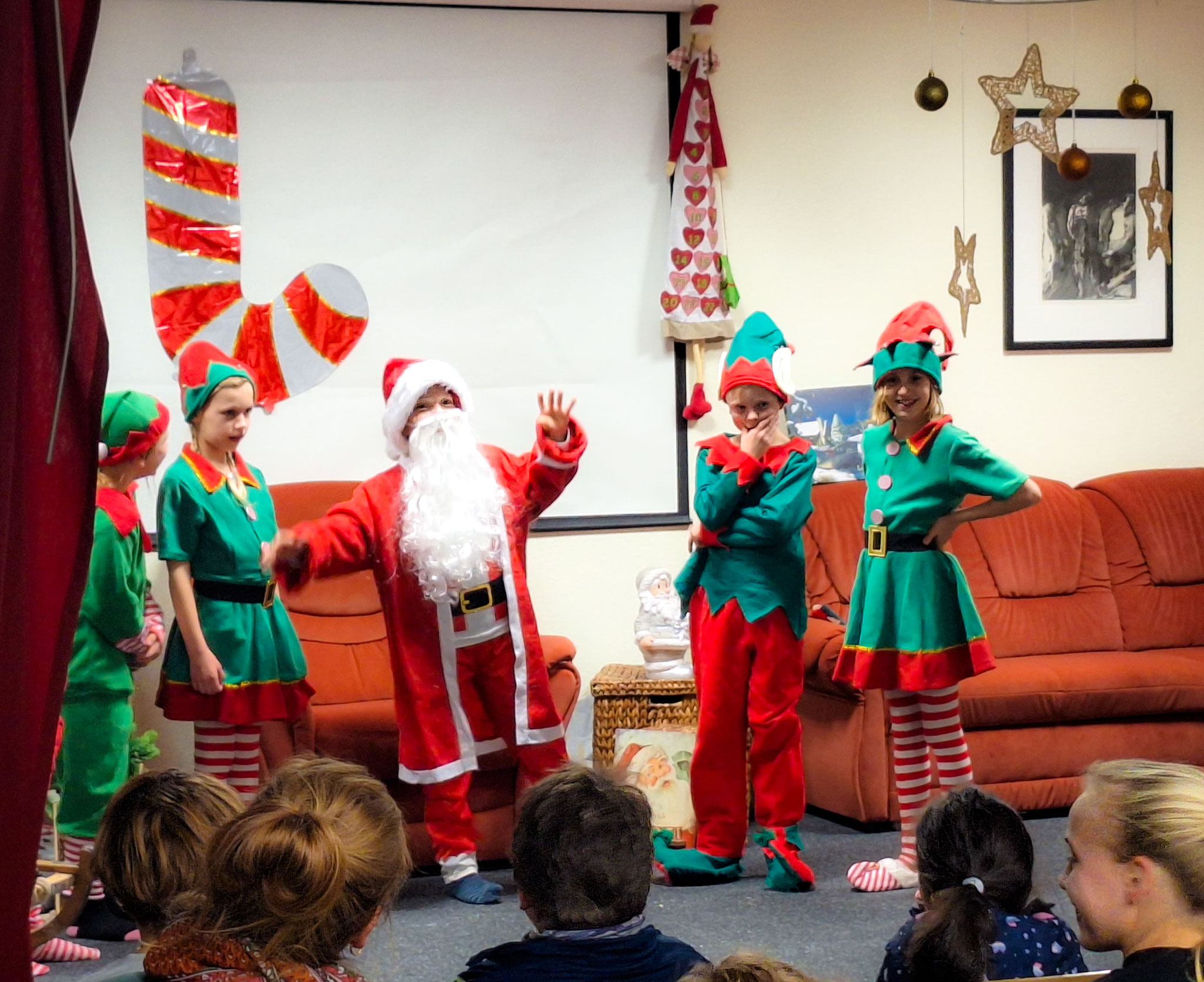 Zahlreiche Besucher ließen sich dies nicht entgehen und so war es nicht verwunderlich, dass der Schulhof am 27. November bereits um 16 Uhr gut gefüllt war, als die Kinder der Theater AG alle Anwesenden mit dem Weihnachtsklassiker „Guten Abend, schön Abend“ begrüßten, um anschließend zum Theaterstück „Weihnachten in Gefahr“ einzuladen. In der Aula konnten Schaulustige dann erleben, wie der Weihnachtsmann mit Hilfe von Wichteln und Engeln von eeinem hartnäckigen Schluckauf befreit werden konnte. Das Schauspiel über die Rettung von Weihnachten wurde insgesamt dreimal aufgeführt. Ein Lob und Dankeschön an unsere spielfreudigen Theaterkinder für ihr Engagement und ihren Einsatz.
