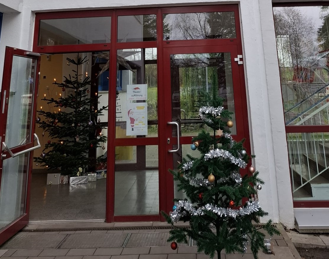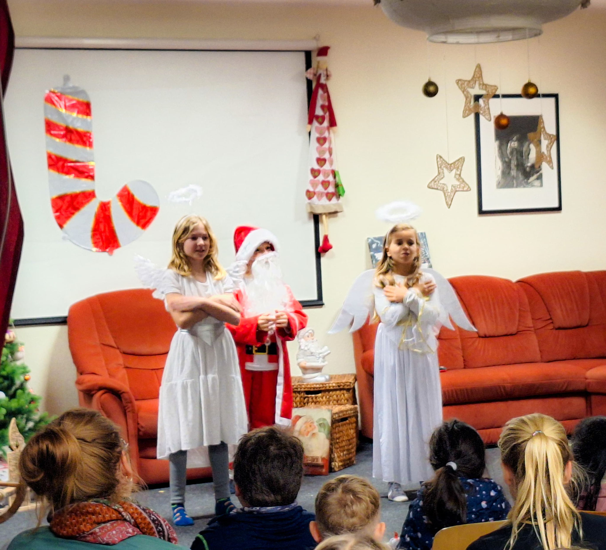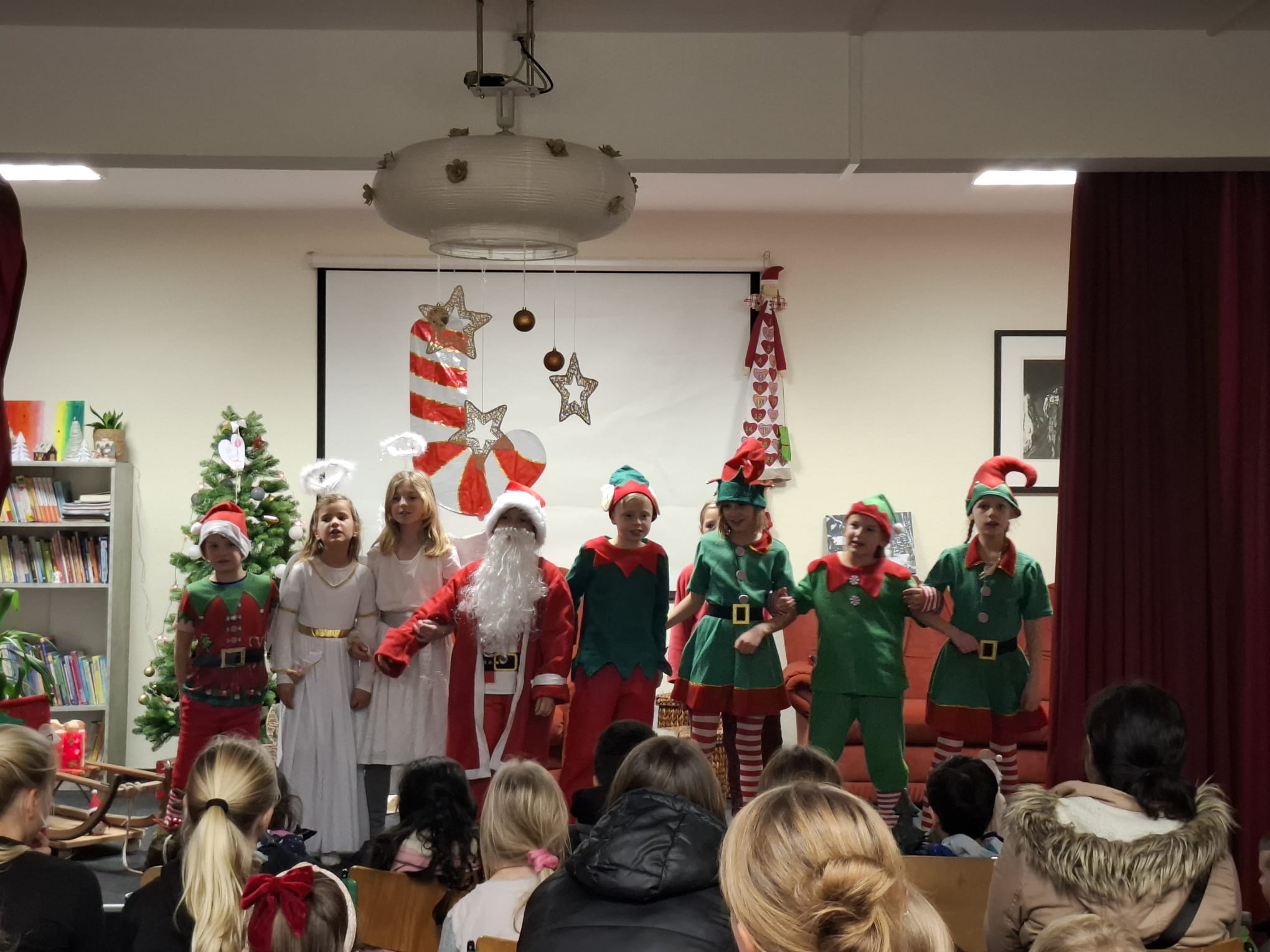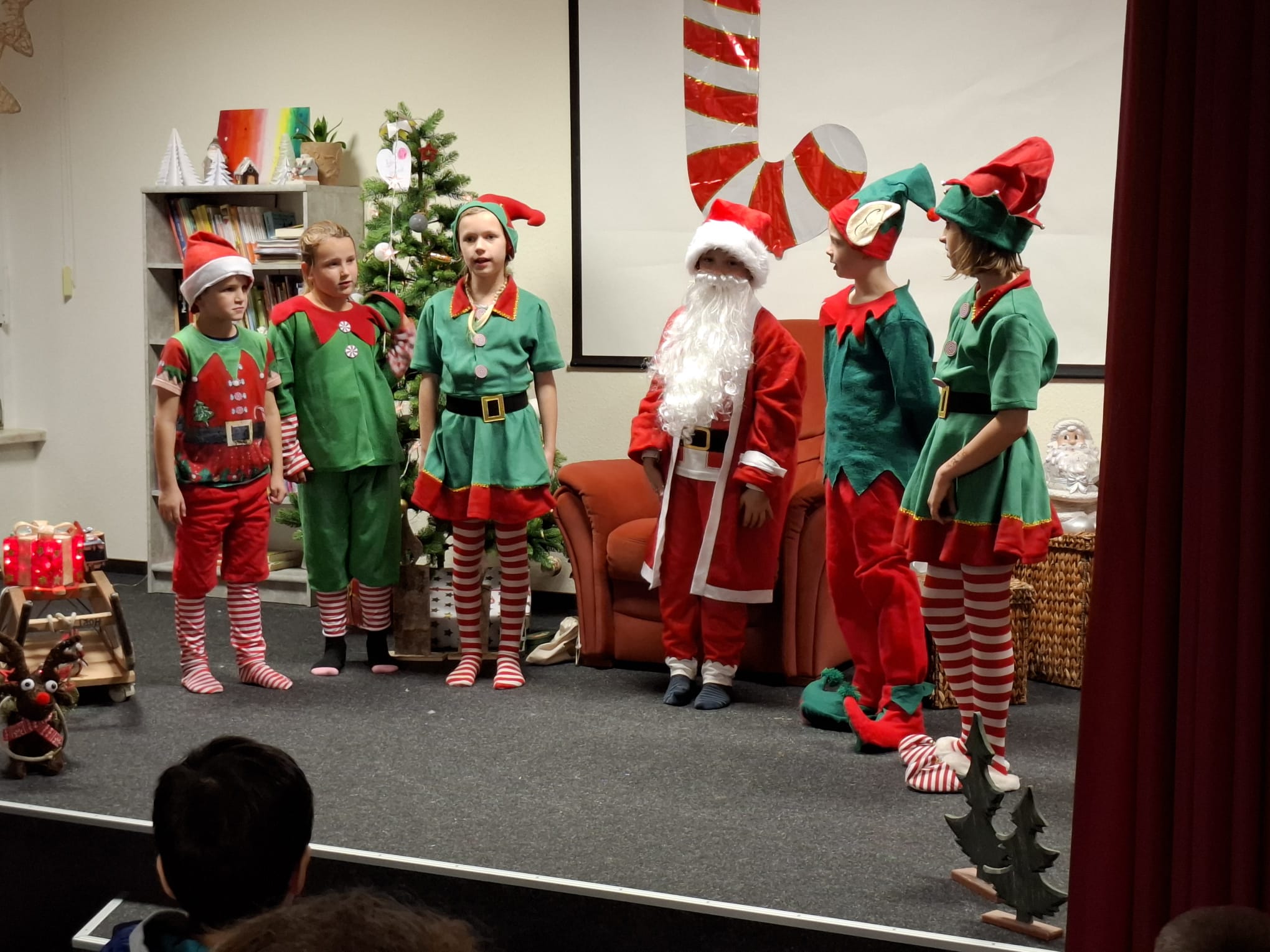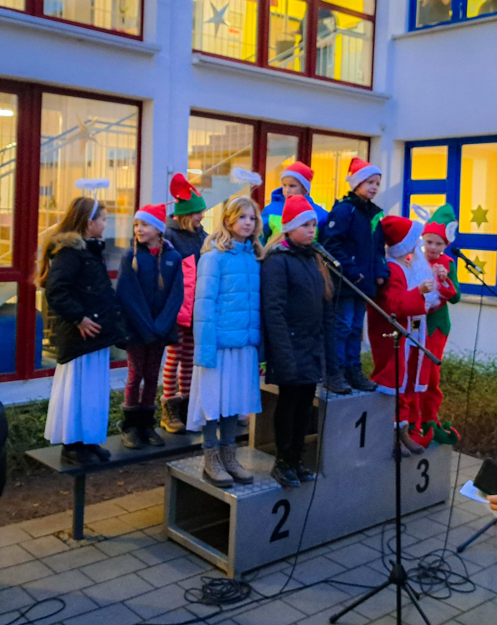 Zahlreiche Besucher ließen sich dies nicht entgehen und so war es nicht verwunderlich, dass der Schulhof am 27. November bereits um 16 Uhr gut gefüllt war, als die Kinder der Theater AG alle Anwesenden mit dem Weihnachtsklassiker „Guten Abend, schön Abend“ begrüßten, um anschließend zum Theaterstück „Weihnachten in Gefahr“ einzuladen. In der Aula konnten Schaulustige dann erleben, wie der Weihnachtsmann mit Hilfe von Wichteln und Engeln von eeinem hartnäckigen Schluckauf befreit werden konnte. Das Schauspiel über die Rettung von Weihnachten wurde insgesamt dreimal aufgeführt. Ein Lob und Dankeschön an unsere spielfreudigen Theaterkinder für ihr Engagement und ihren Einsatz.