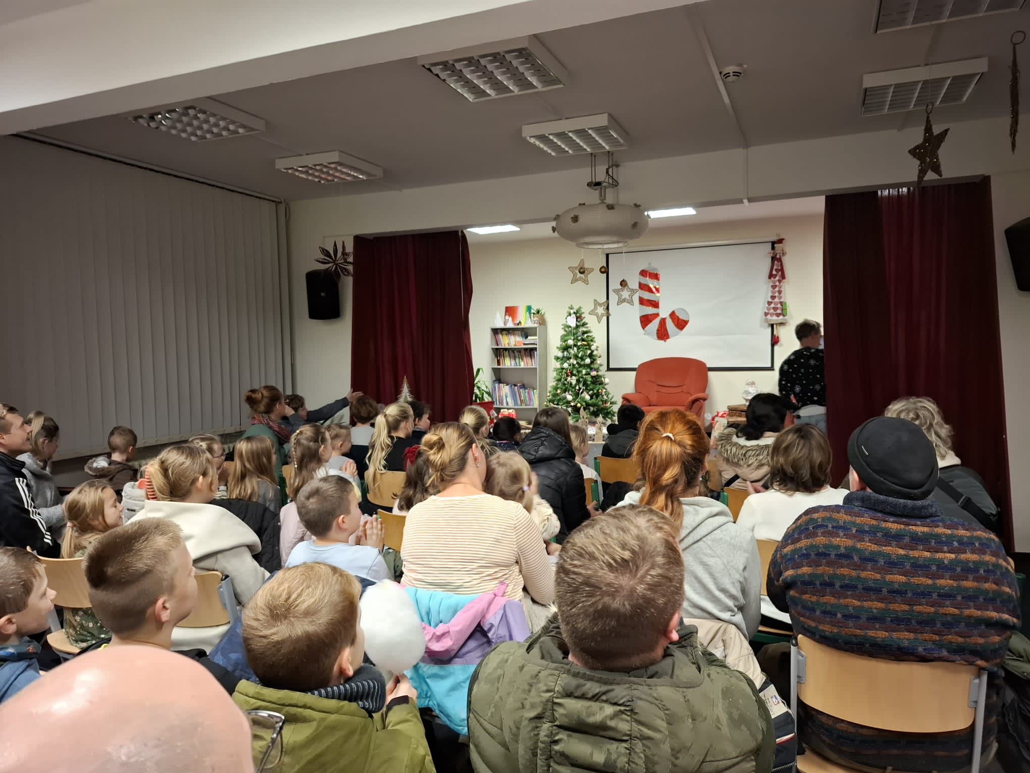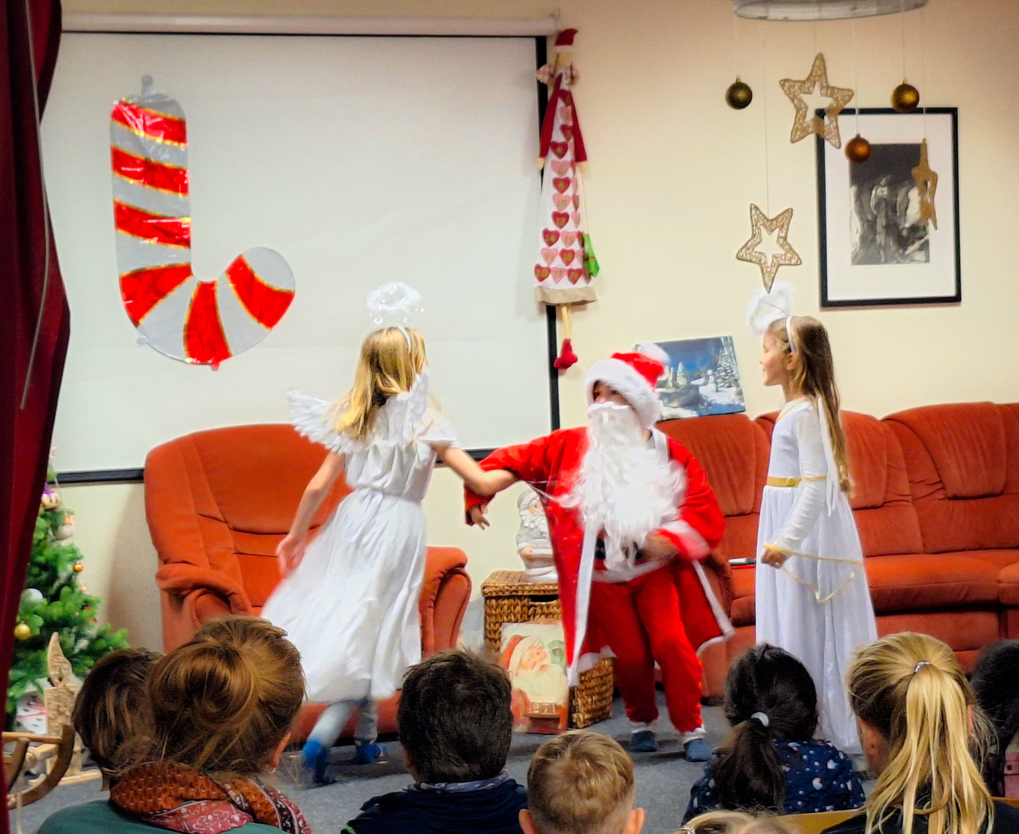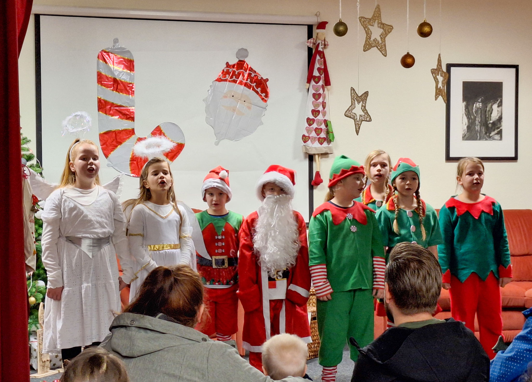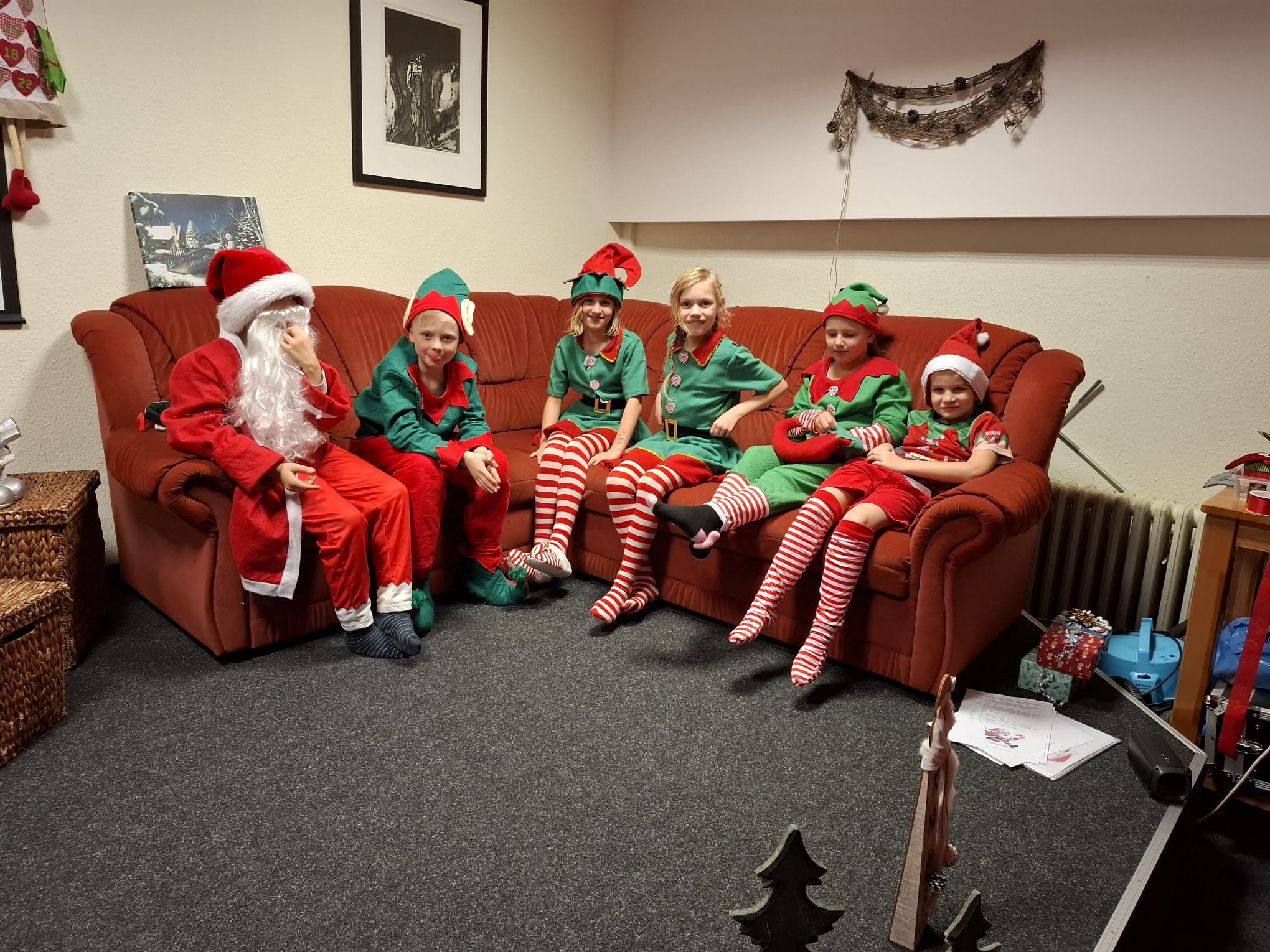 Zahlreiche Besucher ließen sich dies nicht entgehen und so war es nicht verwunderlich, dass der Schulhof am 27. November bereits um 16 Uhr gut gefüllt war, als die Kinder der Theater AG alle Anwesenden mit dem Weihnachtsklassiker „Guten Abend, schön Abend“ begrüßten, um anschließend zum Theaterstück „Weihnachten in Gefahr“ einzuladen. In der Aula konnten Schaulustige dann erleben, wie der Weihnachtsmann mit Hilfe von Wichteln und Engeln von eeinem hartnäckigen Schluckauf befreit werden konnte. Das Schauspiel über die Rettung von Weihnachten wurde insgesamt dreimal aufgeführt. Ein Lob und Dankeschön an unsere spielfreudigen Theaterkinder für ihr Engagement und ihren Einsatz.
