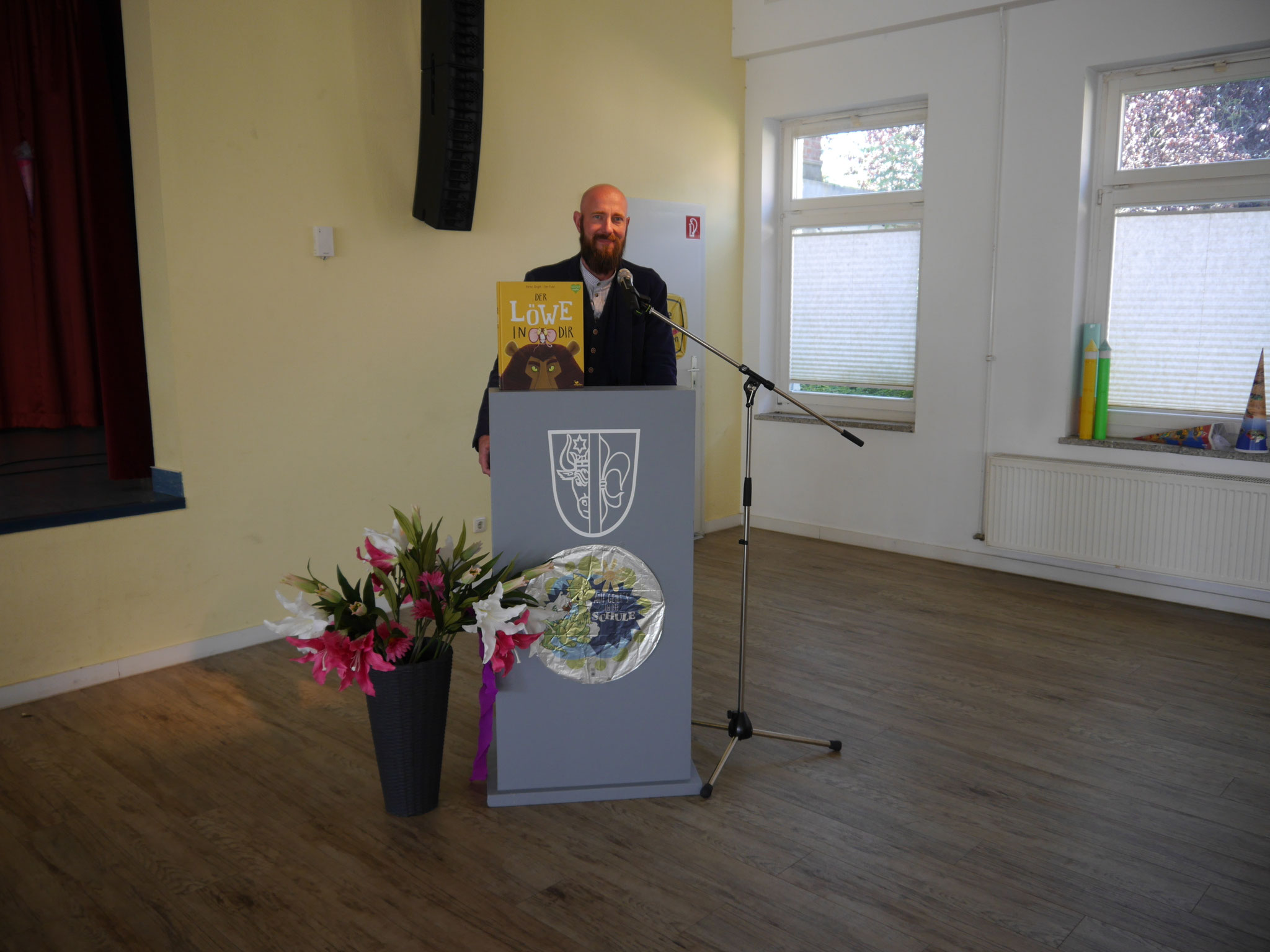 Auch Schulleiter Herr Rosenow setzte in seiner Ansprache auf einen tierischen Vergleich, indem er das Kinderbuch „Der Löwe in dir“ präsentierte. Am Ende stand die Erkenntnis, dass man nicht groß und stark sein muss, um Ängste zu überwinden. Mut und Selbstvertrauen wünschen wir daher auch unseren neuen ABC-Schützen.