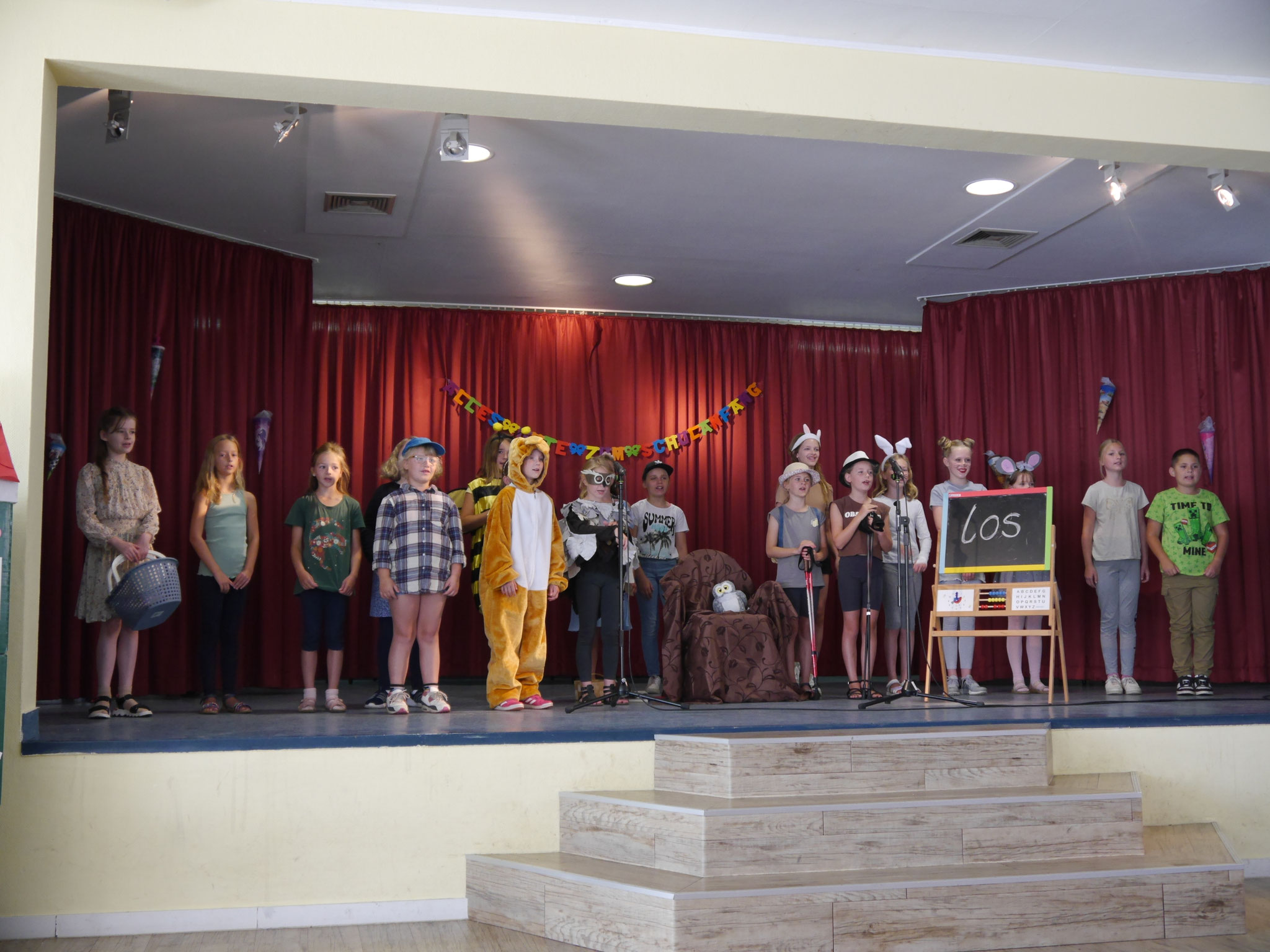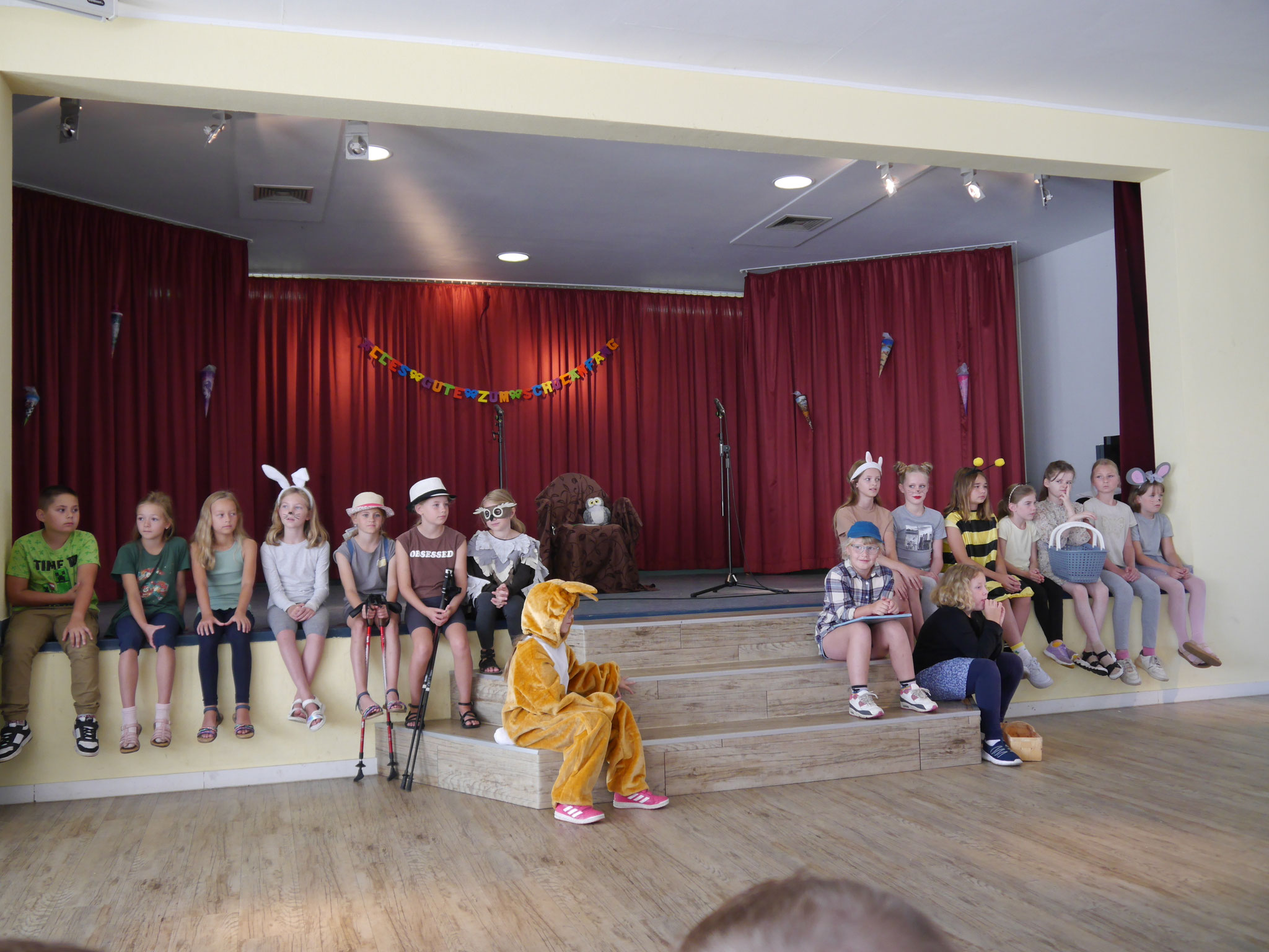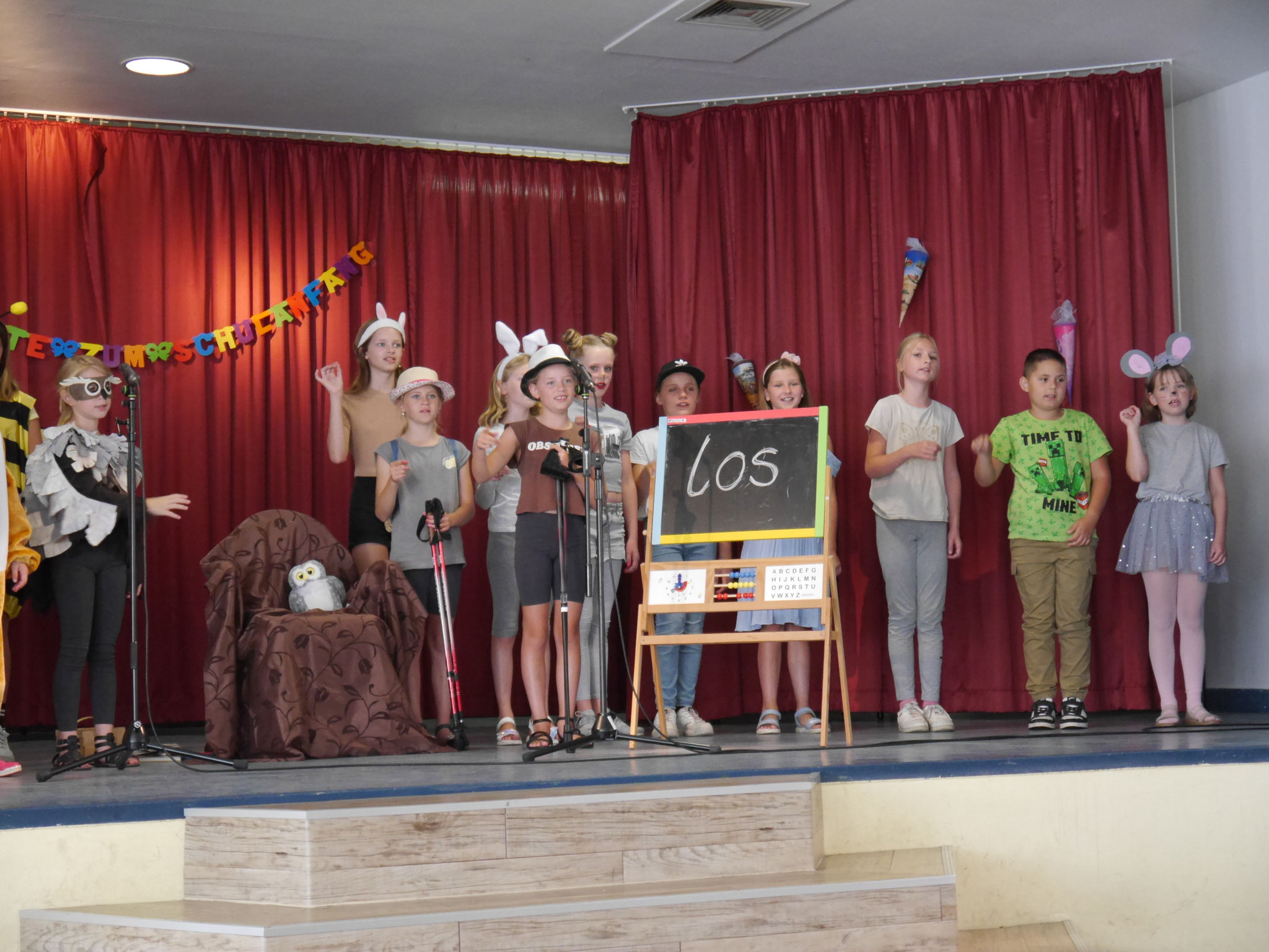 Um ihnen ein wenig die Sorgen und Unsicherheiten zu nehmen, haben unsere Theaterkinder für Vorfreude gesorgt. In einem tierisch-lehrhaften Stück wurde die Notwendigkeit des Lesens und Schreibens auf unterhaltsame Weise vorgeführt. Die Aufführung fand im Rahmen der feierlichen Einschulungsveranstaltung am 31. August im Volksparksaal statt.