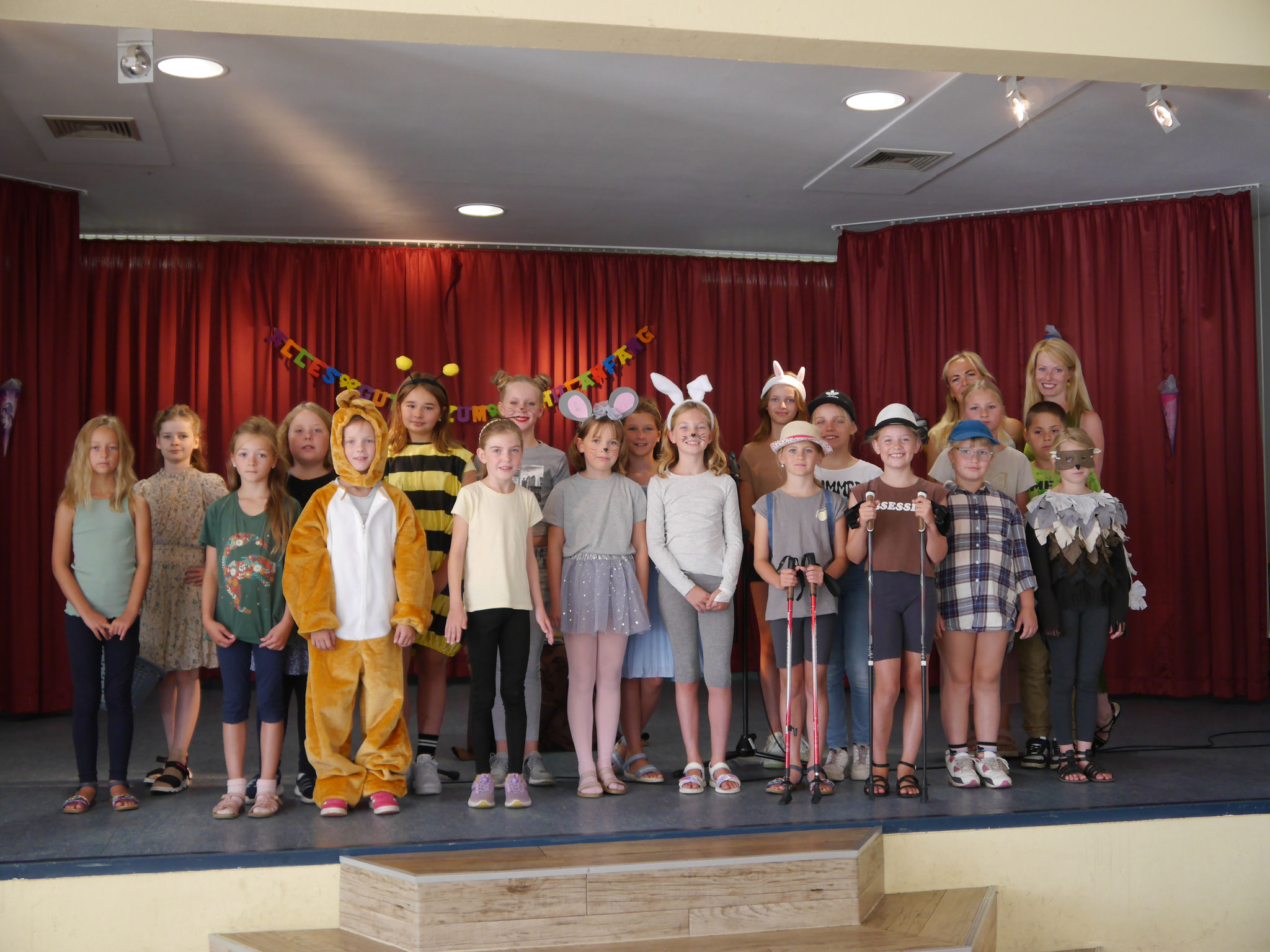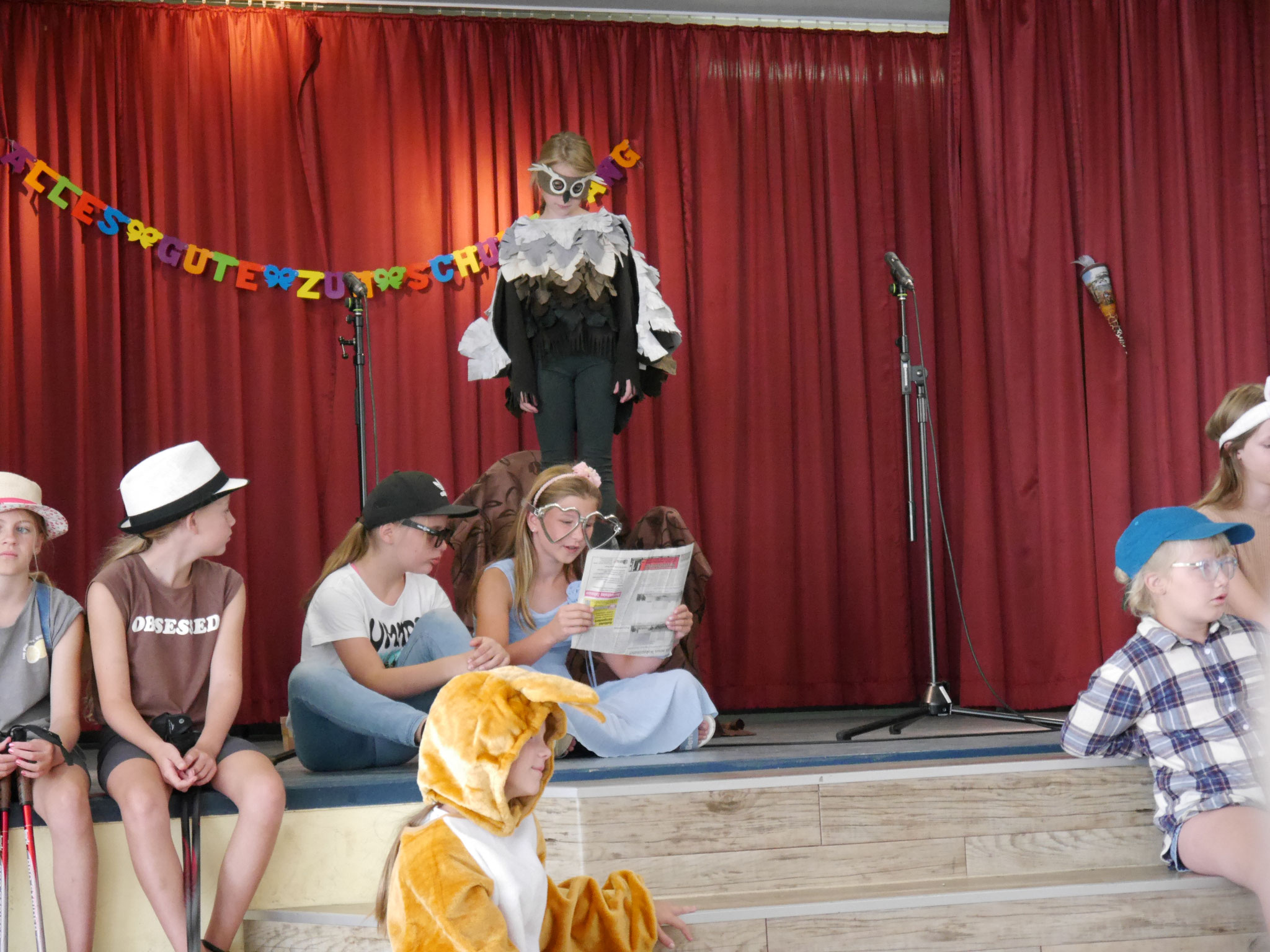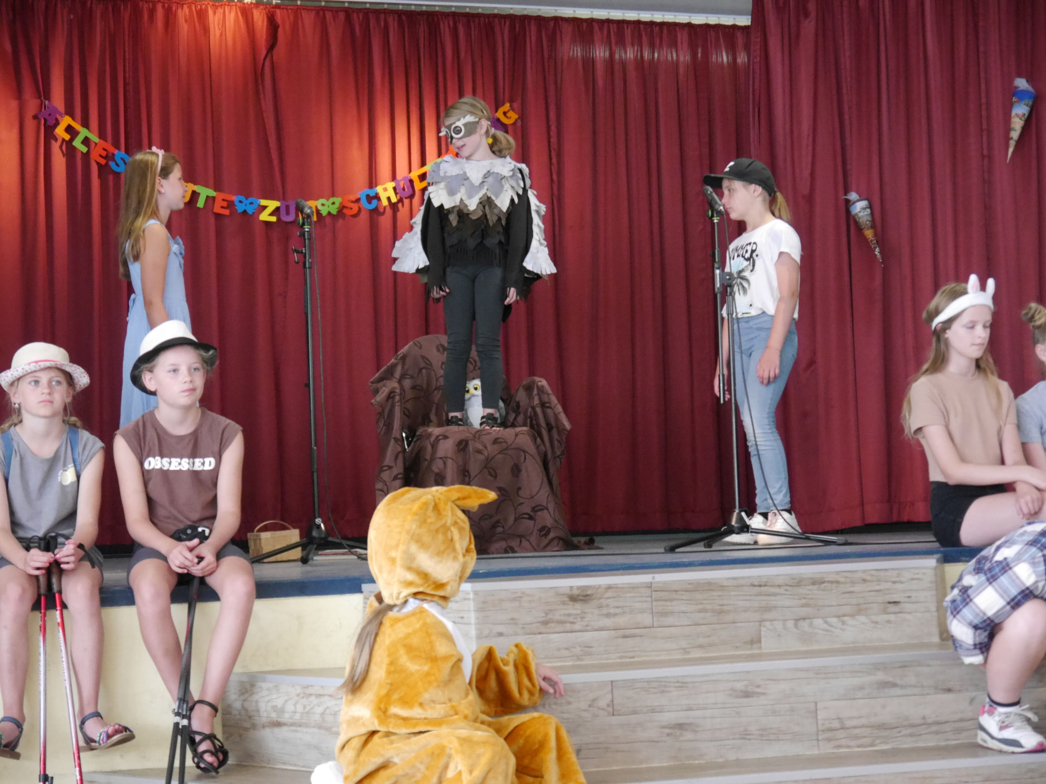 Um ihnen ein wenig die Sorgen und Unsicherheiten zu nehmen, haben unsere Theaterkinder für Vorfreude gesorgt. In einem tierisch-lehrhaften Stück wurde die Notwendigkeit des Lesens und Schreibens auf unterhaltsame Weise vorgeführt. Die Aufführung fand im Rahmen der feierlichen Einschulungsveranstaltung am 31. August im Volksparksaal statt.