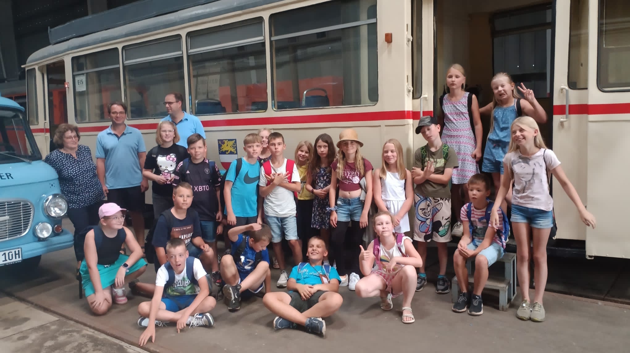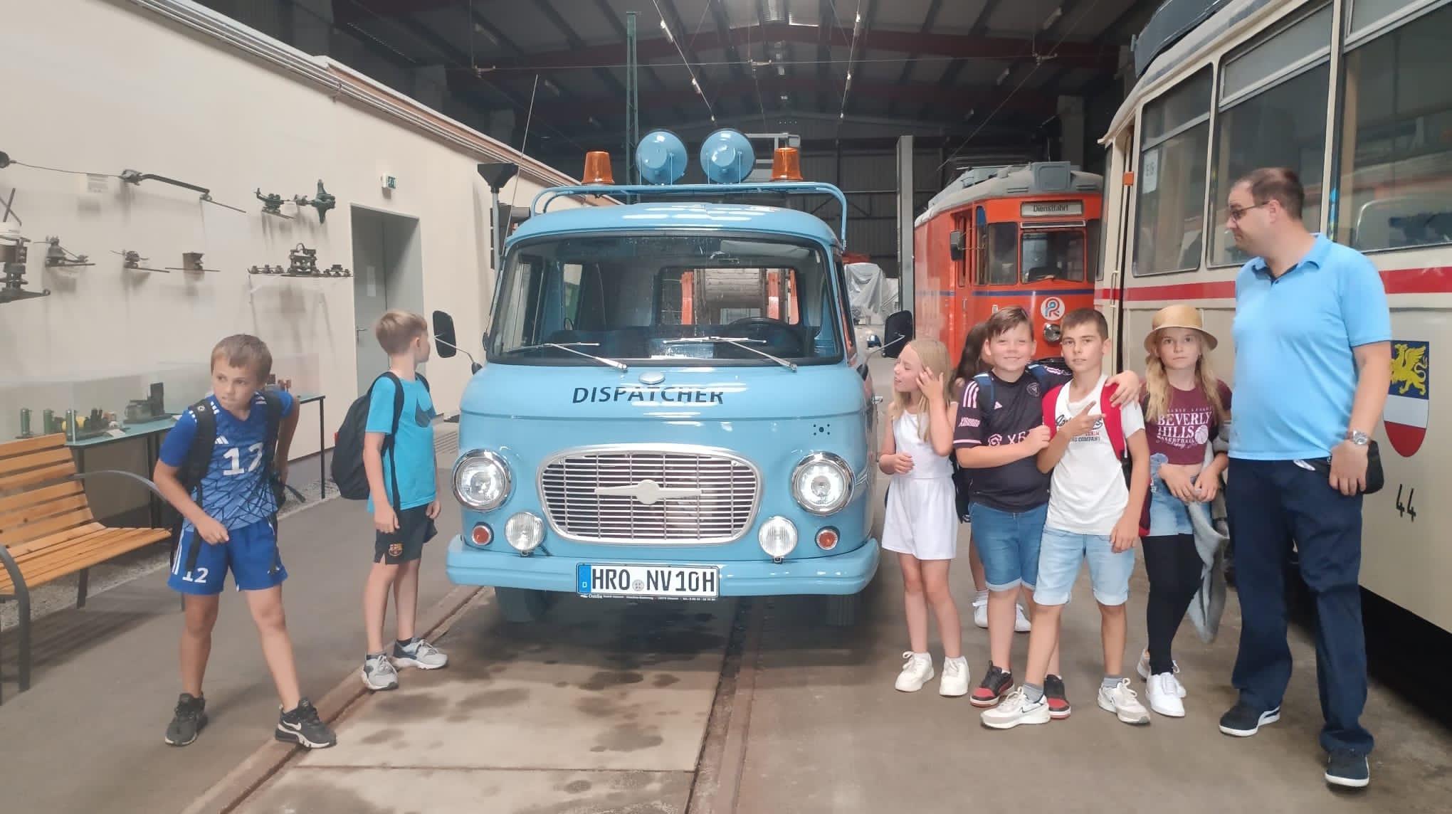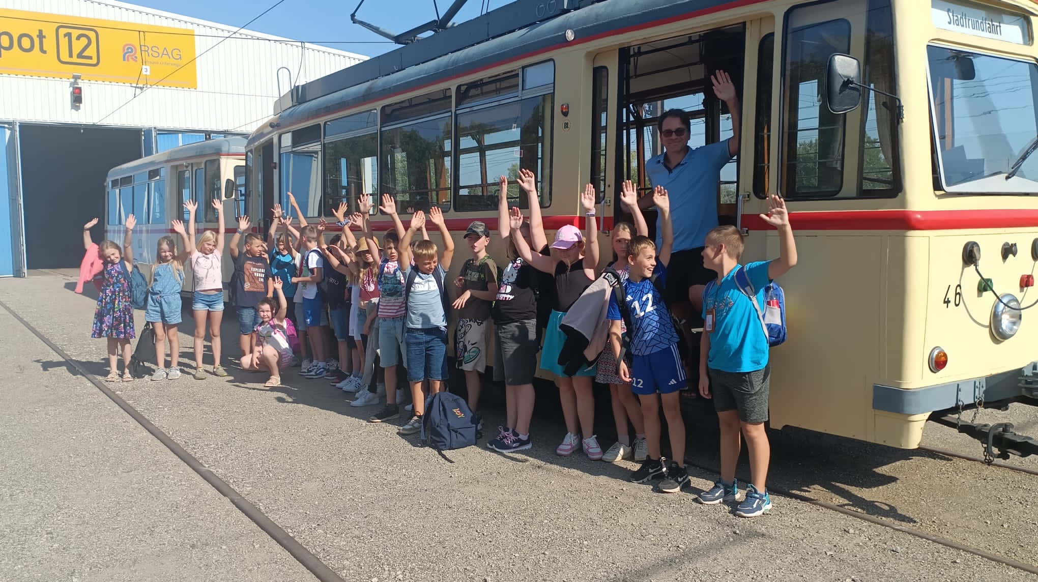 Eingebettet in den Stoff aus dem Sachkundeunterricht aus Klasse 3 – „Wie war das so zu Omas und Opas Zeiten früher …? - und in den Teil „Unser schönes Bundesland MV“ aus Klasse 4, unternahmen wir eine kleine Zeitreise durch die größte Stadt und das wirtschaftliche Oberzentrum von MV: Am 03. September 2024 starteten wir gemeinsam mit Frau Schmitz und einem Elternpaar eine Exkursion nach Rostock zur Rostocker Straßenbahn AG (RSAG).