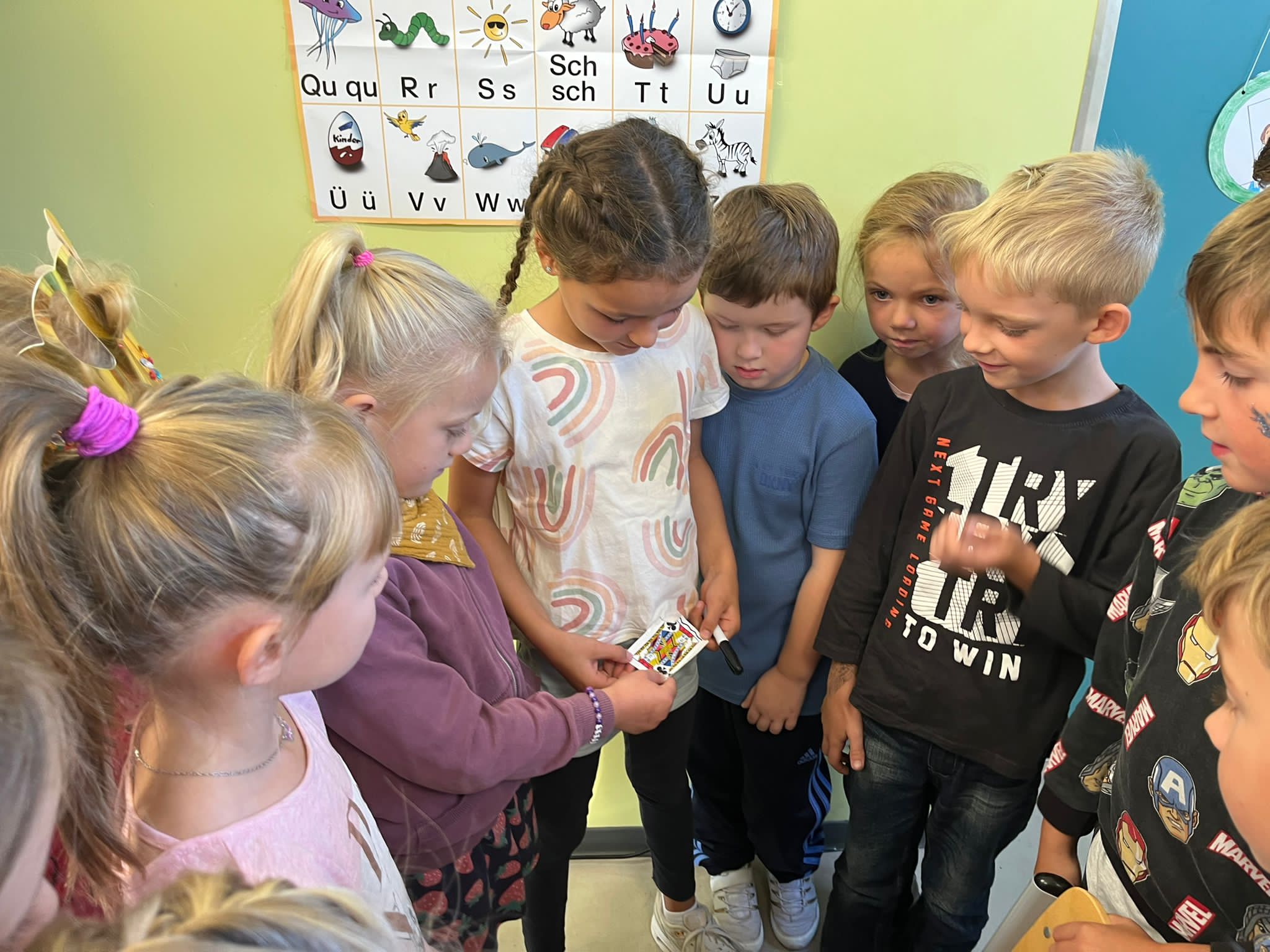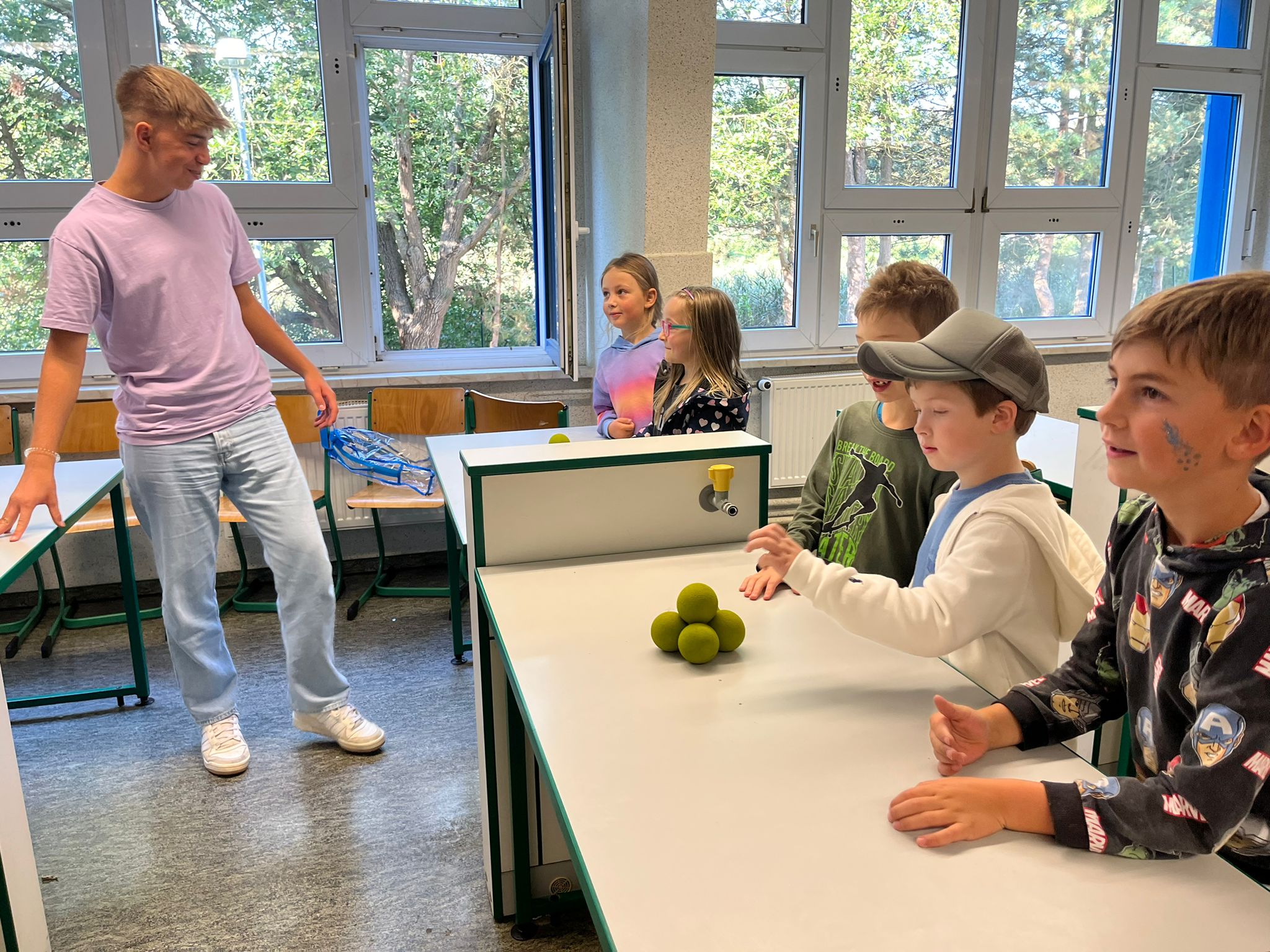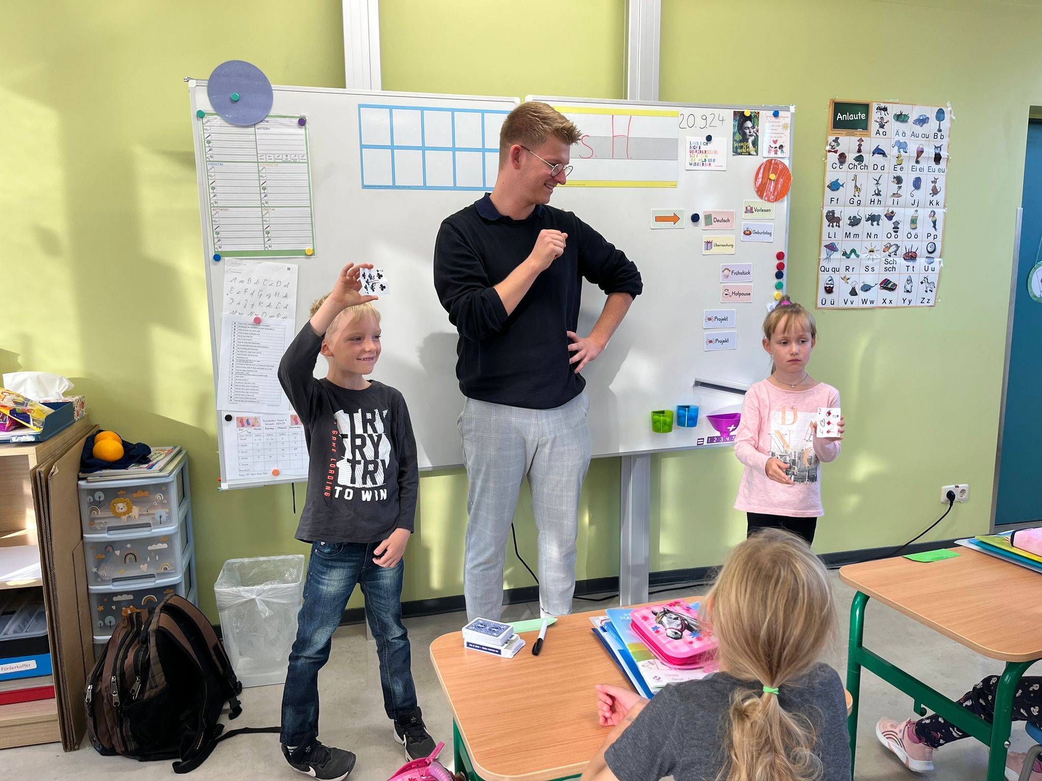 Vom 18.09. – 08.10.2024 absolvierte Jonas Kirchenberg sein Orientierungspraktikum an unserer Grundschule. Er ist nicht nur angehender Lehrer, sondern bereits ein professioneller Zauberer, weshalb wir mit ihm magische Momente erleben durften. Die Kinder wurden von seinen Künsten buchstäblich verzaubert. Mit leuchtenden Augen wurden sie Zeugen, wie z.B. Spielkarten auf unerklärliche Weise verschwanden und in völlig unversehrten Orangen wieder auftauchten oder Schüler plötzlich die Karten ihrer Klassenkameraden in den Händen hielten. Wie schön wäre es, wenn der Zauberlehrer die Kinder doch dauerhaft in solch aufmerksame und gespannte Schüler verwandeln könnte :-)