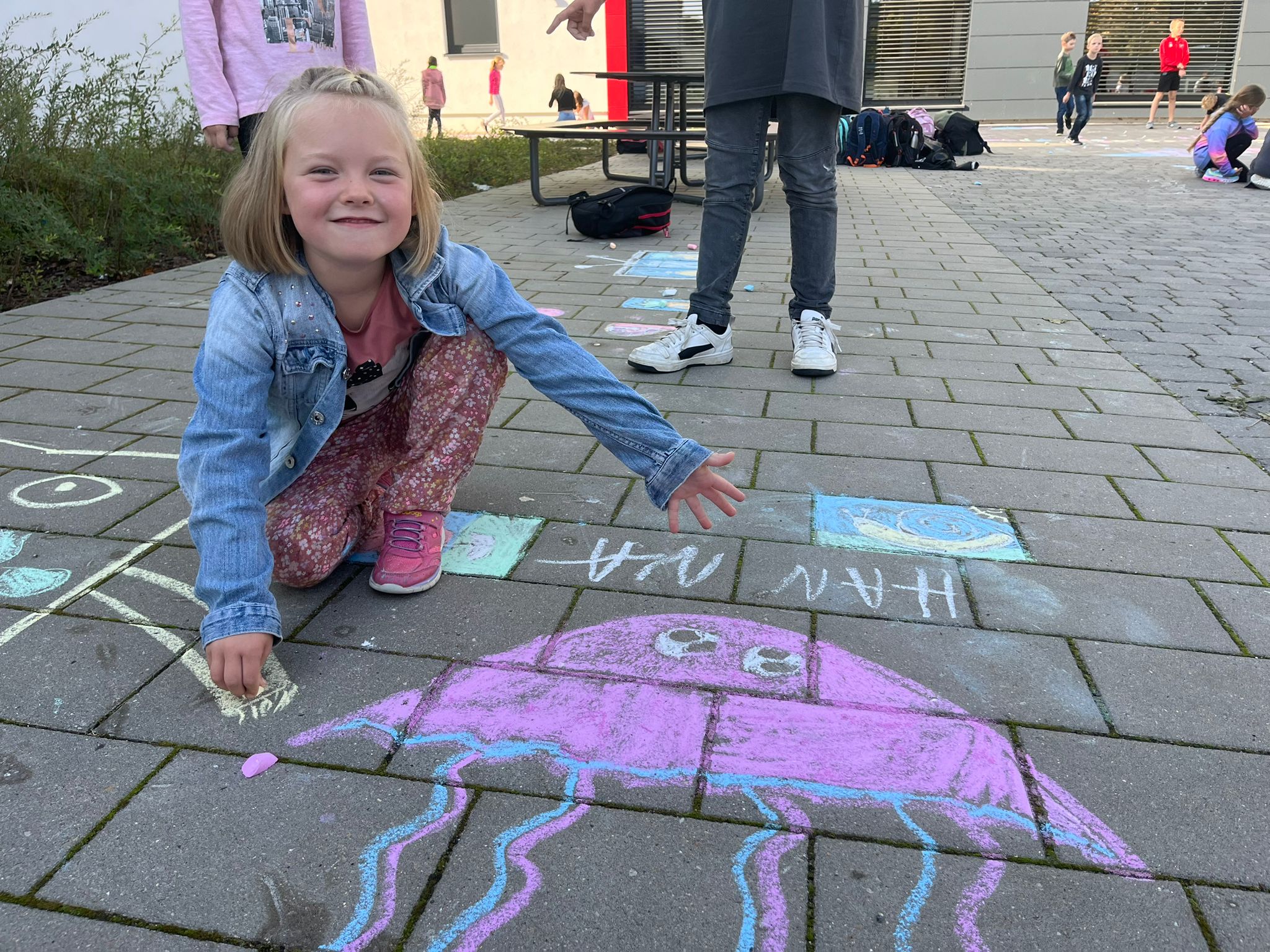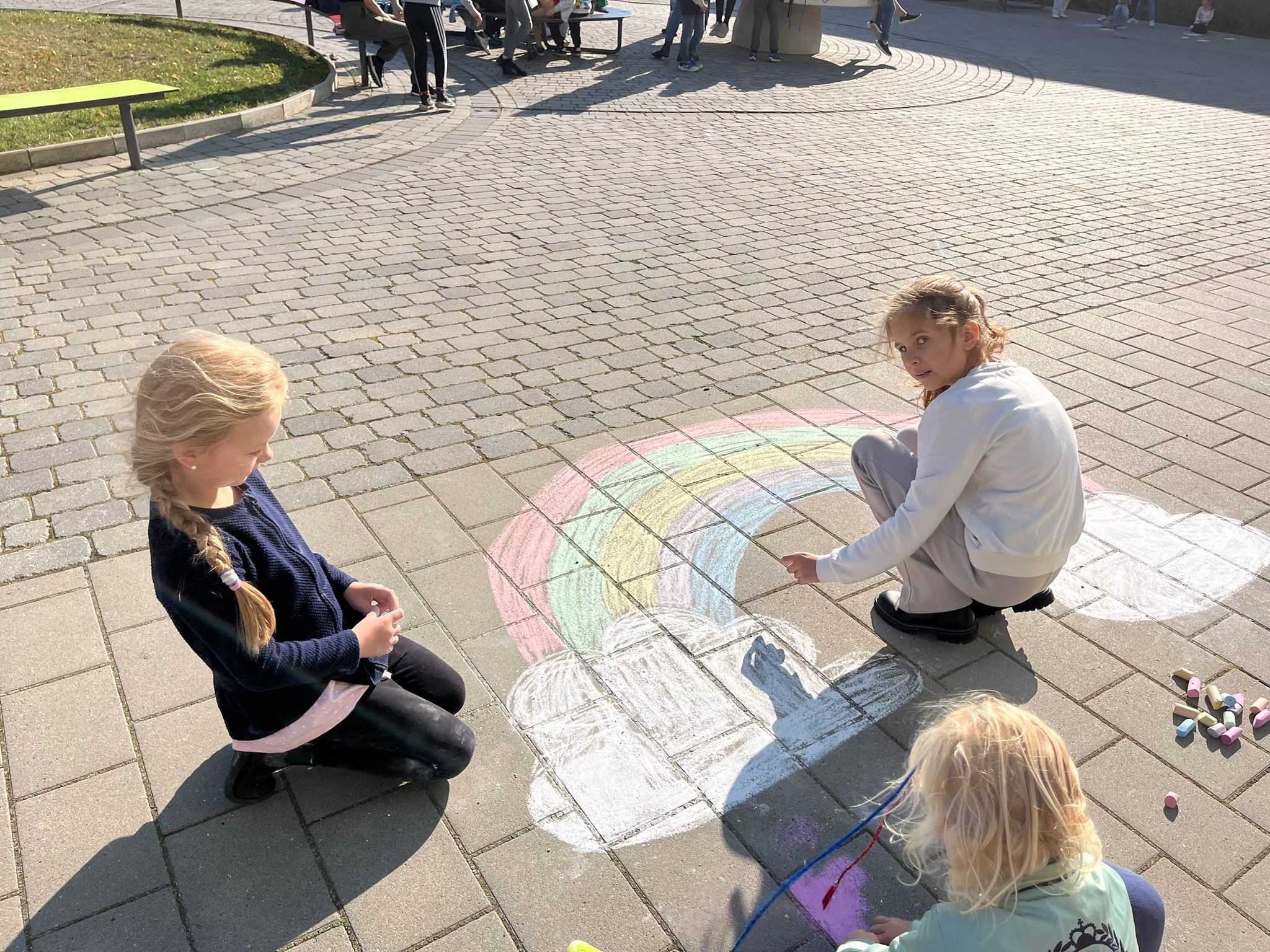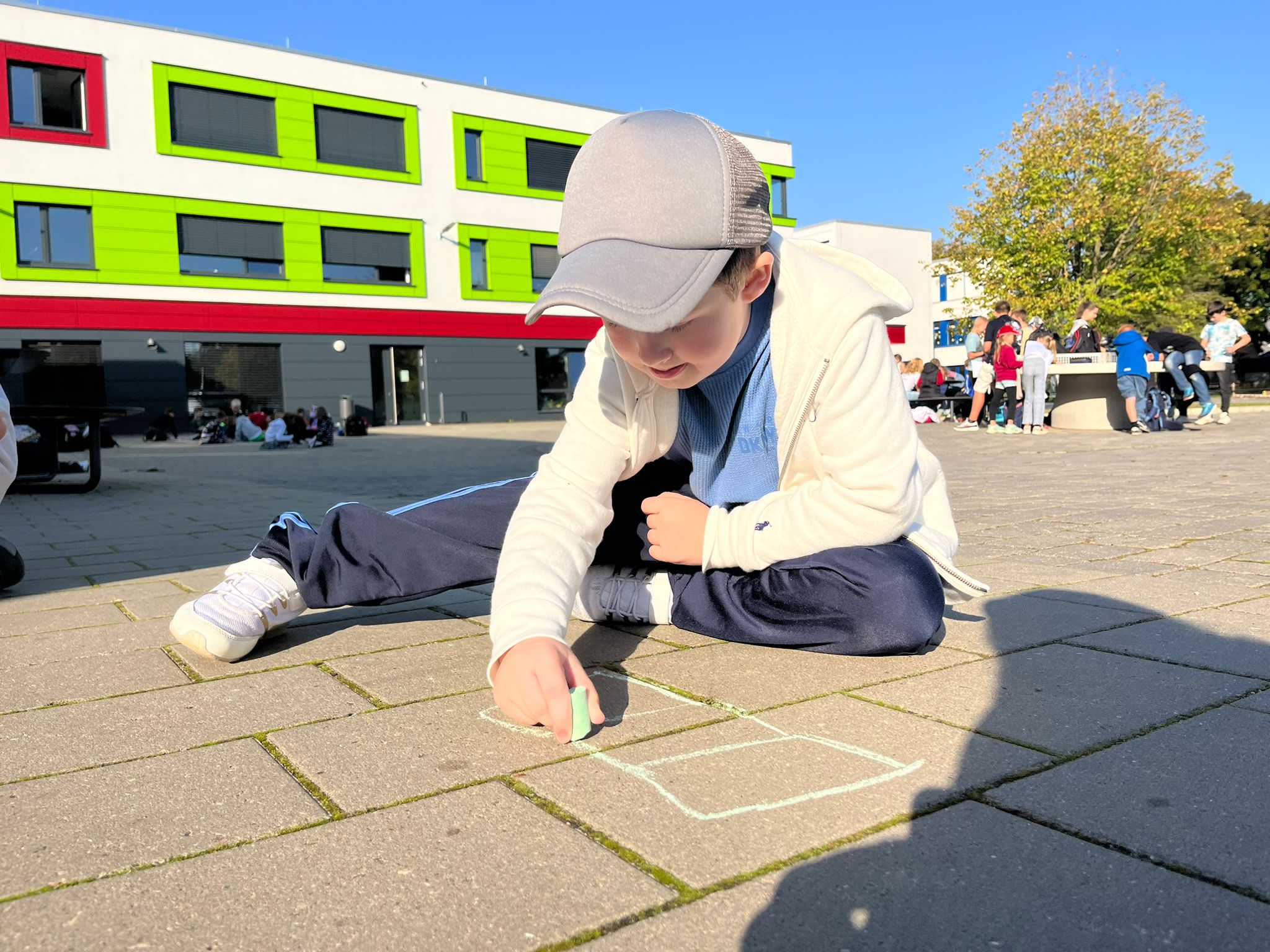 Auch in diesem Jahr wurde der Weltkindertag an der Anne-Frank-Schule feierlich begangen. Am 20. September bereiteten die Schüler der Regionalen Schule gemeinsam mit ihren Klassenlehrern verschiedene Projekte für die Grundschulkinder vor. So konnten sich die „Kleinen“ beispielsweise kreativ auf dem Schulhof betätigen und diesen durch das Aufmalen lustiger Kreidetiere verschönern. Unterstützung erhielten sie hierbei von der Klasse 5a. Ebenfalls gut angenommen wurde die Spiel- und Spaß-Station der 10a, die zum Dosenwerfen und Ubongo-Spiel einluden. Des Weiteren erlernten die Kinder u.a. Volleyballtechniken, spielten Basketball, absolvierten eine Schulrallye, bastelten Herbstliches oder ließen sich leckere gebackene Waffeln schmecken. Ein rundum gelungener Vormittag! Vielen Dank an die „Großen“, die den Grundschülern abwechslungsreiche Stunden bescherten.