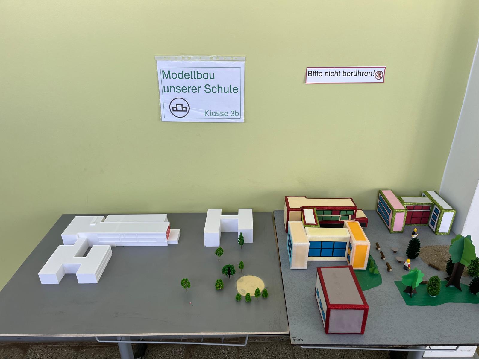 Die fertigen Modelle wurden anschließend in der Schule ausgestellt. Dadurch konnten auch andere Klassen die Werke bestaunen und etwas über den Modellbau lernen. Stolz präsentierten die Kinder der Klasse 3b ihre Modelle sogar unserem Schulleiter. In einer kleinen Ausstellung erzählten sie etwas über deren Aufbau und standen Herrn Rosenow Rede und Antwort.